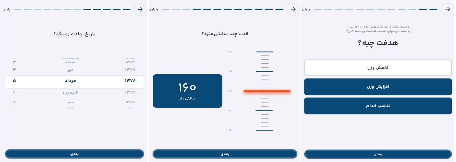 در ابتدای استفاده از اپلیکیشن، کاربر اطلاعات پایه خود را مانند تاریخ تولد، قد، وزن فعلی و وزن هدف وارد میکند. این دادهها به برنامه کمک میکند تا شاخص توده بدنی (BMI) و میزان کالری مورد نیاز روزانه را بهصورت دقیق محاسبه کند. همچنین، کاربر هدف اصلی خود را از بین کاهش وزن، افزایش وزن یا حفظ تناسب اندام انتخاب میکند تا مسیر برنامهریزی بهطور کامل مشخص شود.