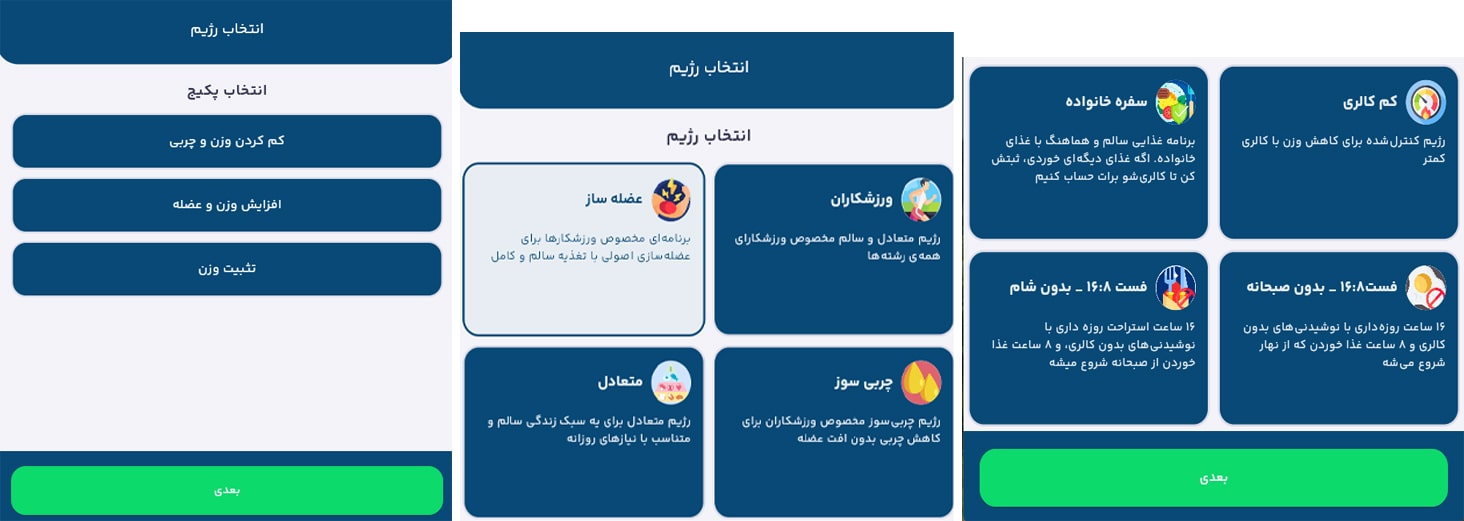پس از تعیین هدف کلی، کاربر میتواند از بین سه پکیج اصلی «کم کردن وزن و چربی»، «افزایش وزن و عضله» یا «تثبیت وزن» یکی را انتخاب کند. هر پکیج با توجه به شرایط بدنی و نیاز کاربر طراحی شده و تفاوت آنها در ترکیب غذایی، میزان کالری و تمرکز اصلی برنامه است.