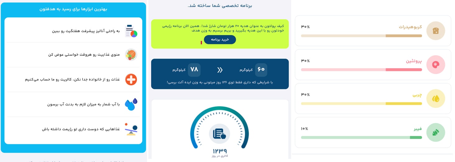 بعد از تکمیل اطلاعات و انتخاب رژیم، برنامه یک طرح تغذیهای اختصاصی برای کاربر میسازد که شامل میزان کالری روزانه، درصد مناسب کربوهیدرات، پروتئین، چربی و فیبر، و همچنین مدتزمان تقریبی رسیدن به هدف است. این بخش به کاربر کمک میکند تا دقیقاً بداند چه مقدار و چه نوع مواد غذایی باید مصرف کند. حتی برای انگیزه بیشتر، برنامه هدیه اعتباری مانند ۲۰ هزار تومان شارژ کیف پول هم در نظر میگیرد.